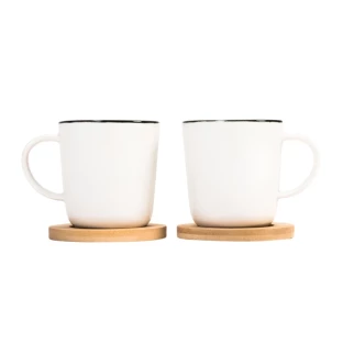 Zestaw składa się z dwóch kubeczków ceramicznych o pojemności 150 ml. Dodatkowo zawiera bambusowe podstawki. Bambus jest produktem naturalnym - znakowanie na każdej sztuce podstawki może się od siebie różnić.